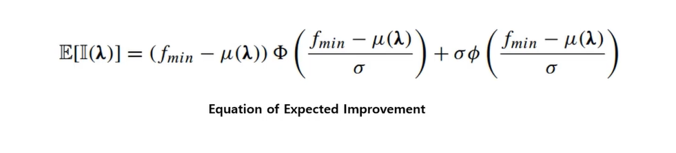 μ( λ ), σ 알고 있을 때, 현재까지 관측된 가장 좋은 결과(f_min)와 μ( λ )차이를 기반으로 구성됨