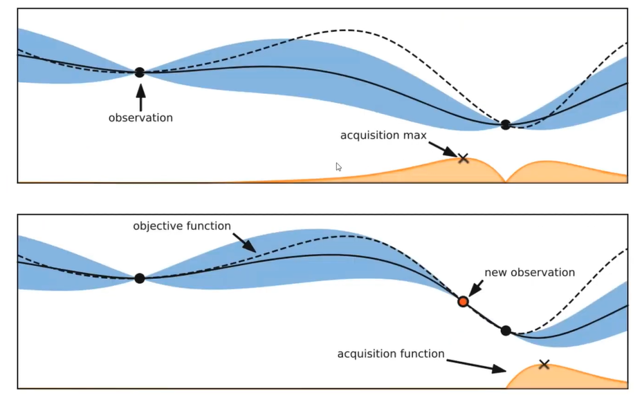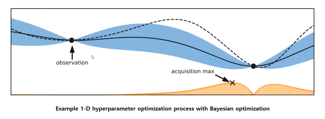 - acquisition function이 주황색 그래프로 묘사 : acquisition max