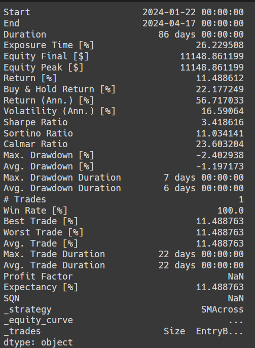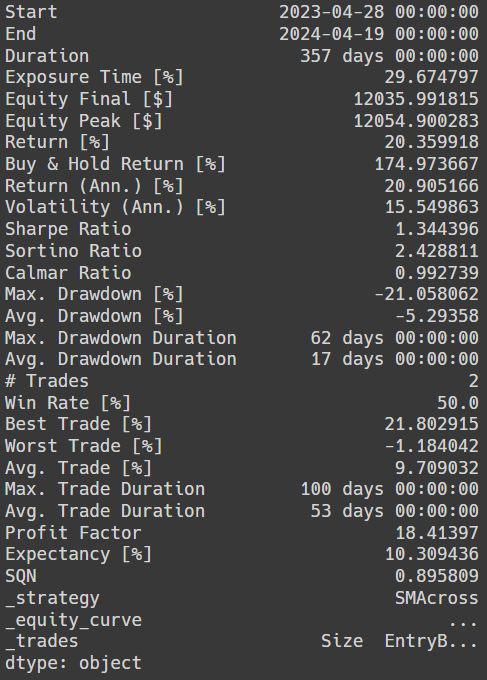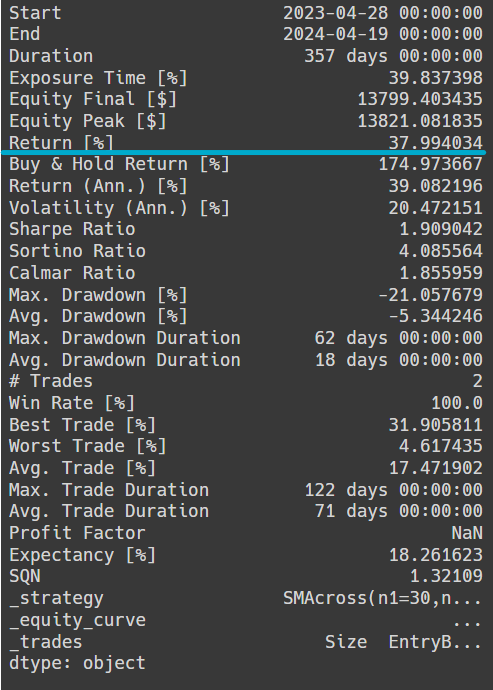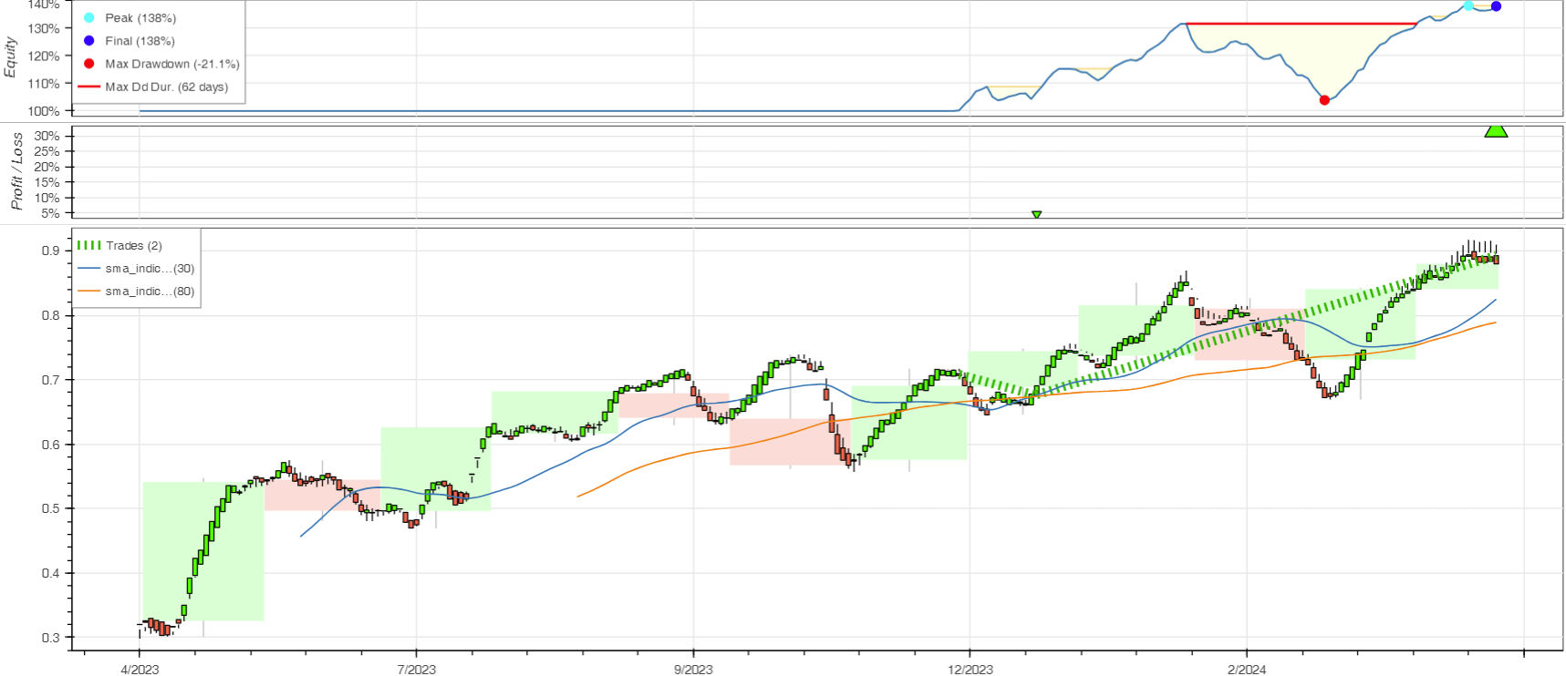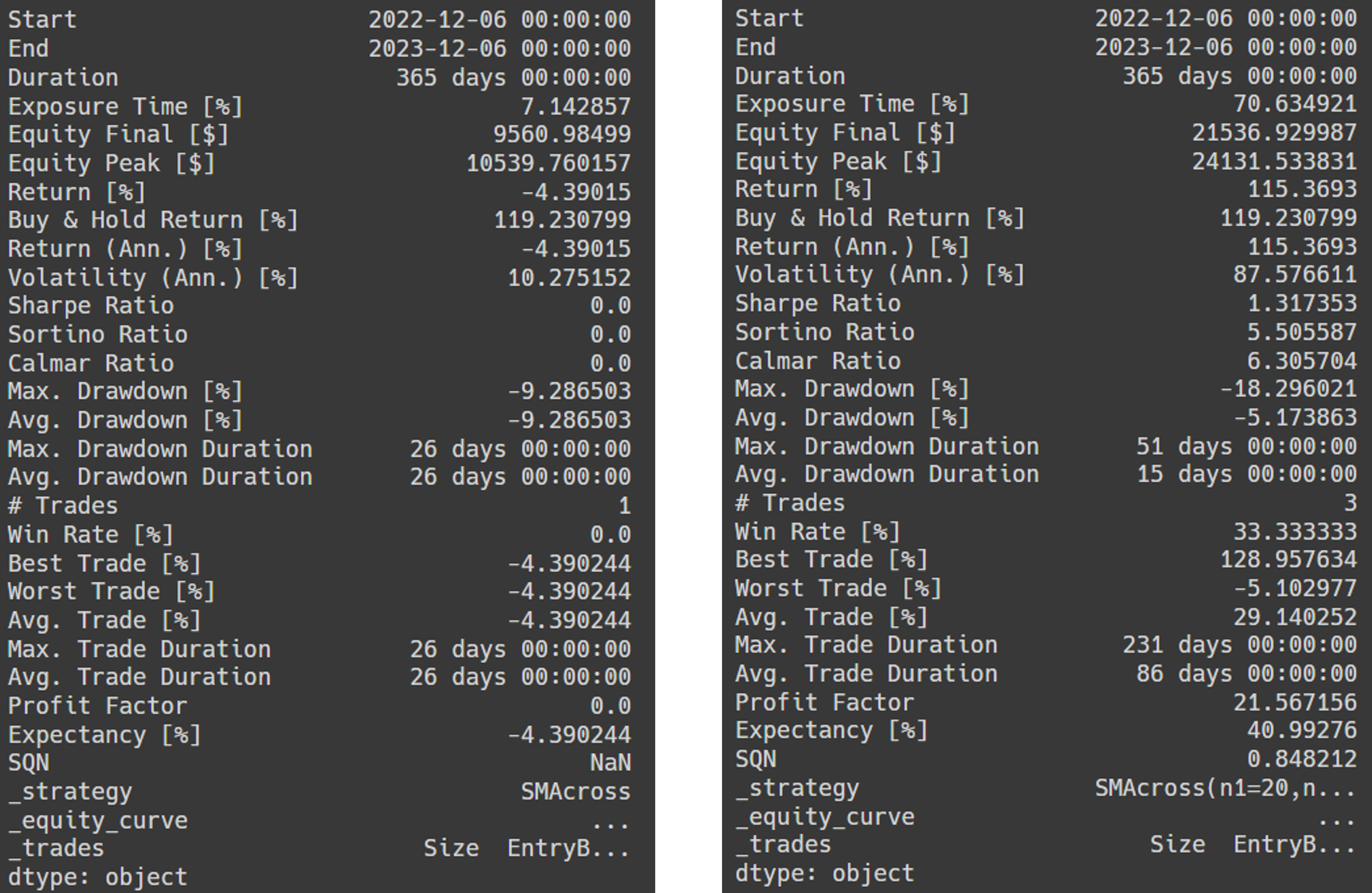 최적화를 수행하면, simple moving average의 값을 설정한 stride로 건너다니며 최적의 SMA값을 찾아 설정해 가장 높은 Return [%]이 나오는 SMA 2개를 찾아준다.