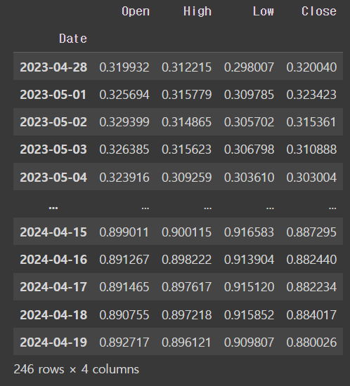 값이 소수점인 이유는 액면분할, 주식 병합 등의 이유로 액면가가 달라서, MinMaxScaler을 통해 (-1, 1)사이의 값으로 Scaling을 진행해서 그런 것이다.