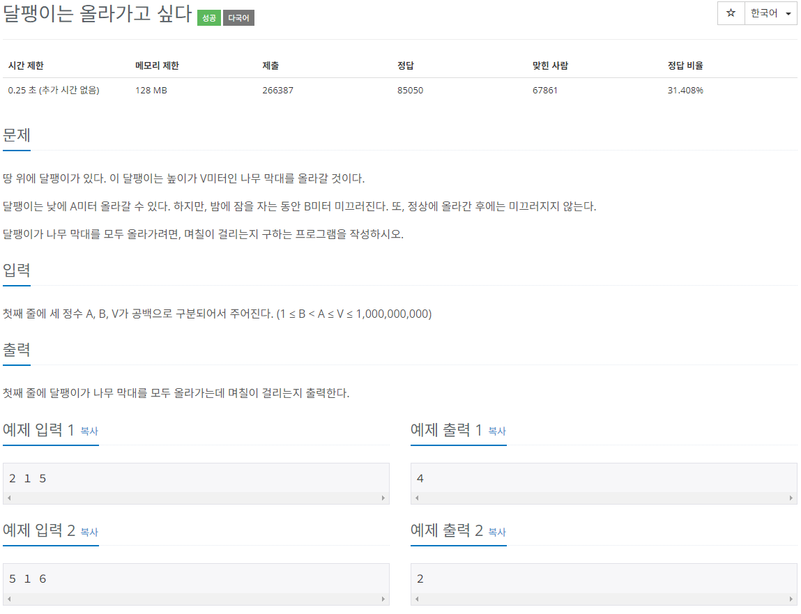 그리고 분모가 0인 경우 즉, a==b일 때는 계산이 불가능하기 때문에 무조건 하루(낮에 등반)만에 등반이 완료되는 높이가 주어질 것이다.