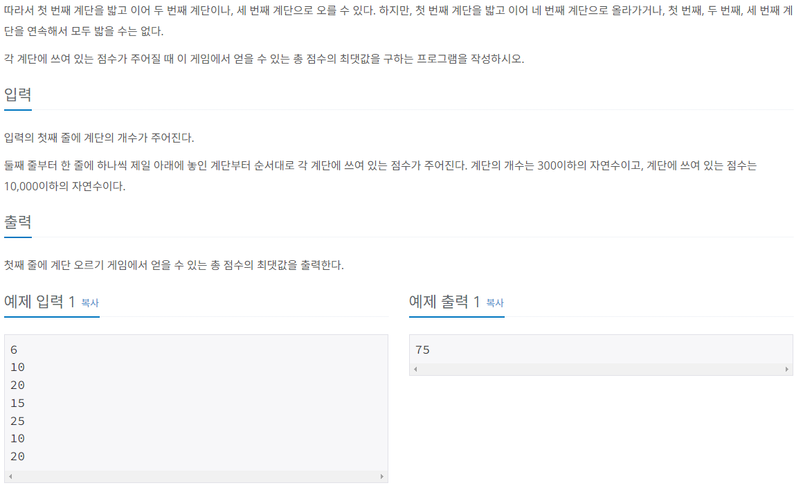 - N-3번째 까지 계단의 최댓값과, N-1번째는 반드시 밟아야 하므로 계단에 적힌 숫자를 더해준다